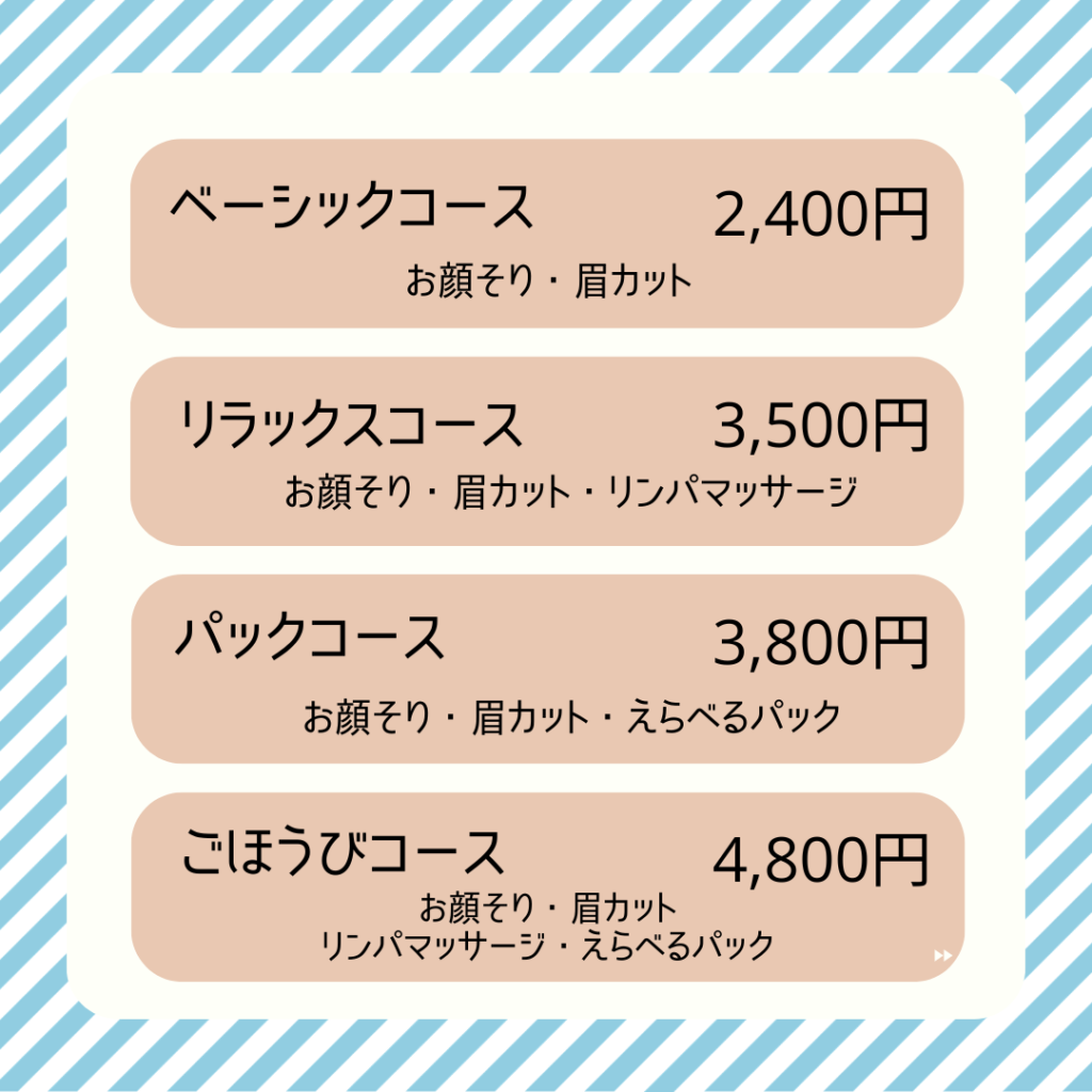 お顔そりだけでなく、リンパマッサージ(顔・首・デコルテ・肩)や、お肌の悩みに合わせて選べるパックなどもあります。